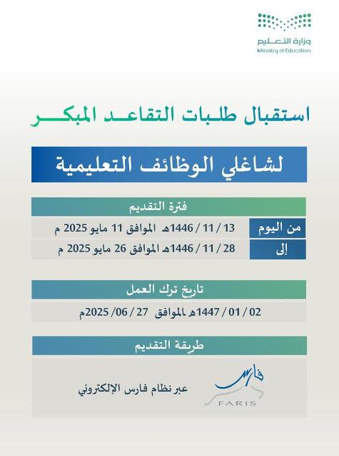 أعلنت وزارة التعليم عن بدء استقبال طلبات التقاعد المبكر لشاغلي الوظائف التعليمية، وذلك اعتباراً من اليوم الأحد 13/ 11/ 1446هـ الموافق 11 مايو 2025م، ويستمر حتى يوم الاثنين 28/ 11/ 1446هـ الموافق 26 مايو 2025م.