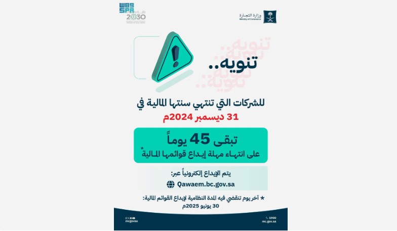 دعت وزارة التجارة الشركات المنتهية سنتها المالية بنهاية 2024، إلى إيداع قوائمها المالية بموعد أقصاه يوم الاثنين 30 يونيو 2025، وذلك تجنبًا لإيقاع الغرامات المالية وفقًا لنظام الشركات.