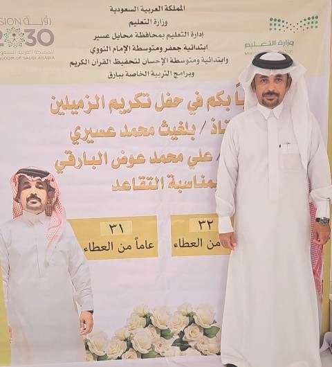 احتفى مساء أمس مجمع جعفر والنووي والإحسان وبرامج التربية الخاصة بمحافظة بارق بتقاعد الأستاذان بلغيث محمد عسيري وعلي محمد عوض البارقي بعد رحلة طويلة مع العمل التربوي الميداني امضوها في عدد من المدارس والمحاضن التعليمية .