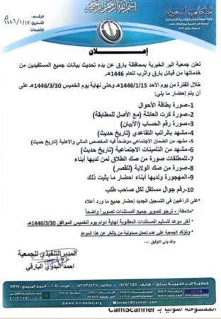 جمعية ” البر ” ببارق تعلن تحديث بيانات مستفيديها