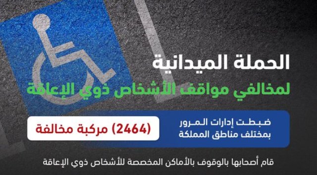 ضبطت إدارات المرور بمختلف مناطق المملكة (2464) مركبة خالفت الأنظمة المرورية بعد أن أوقفها أصحابها في المواقع المخصصة للأشخاص ذوي الإعاقة.