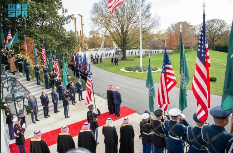 وقد جرت لسمو ولي العهد -حفظه الله- مراسم استقبال رسمية، حيث رافقت الخيالة موكب سموه لدى وصوله، ومن ثم جرى استعراض حرس الشرف، فيما عزفت الفرقة العسكرية الموسيقى، وأطلقت المدفعية 19 طلقة ترحيبًا بسمو ولي العهد، كما التقطت الصور التذكارية عند مدخل البيت الأبيض.