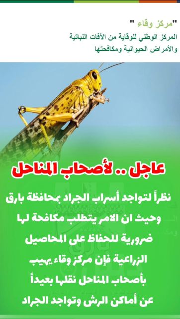 دعا مركز وقاء للوقاية من الآفات النباتية والامراض الحيوانية ملاك المناحل في محافظة بارق بنقلها بعيداً عن أماكن الرش وتواجد الجراد .