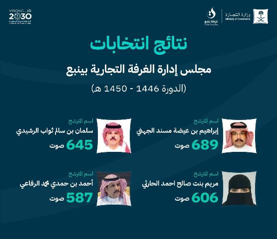 وأسفرت نتيجة التصويت لمجلس إدارة الغرفة عن فوز 4 مترشحين في الانتخابات، وهم: إبراهيم بن عيضة مسند الجهني، وسلمان بن سالم ثواب الرشيدي، ومريم بنت صالح أحمد الحارثي، وأحمد بن حمدي محمد الرفاعي.