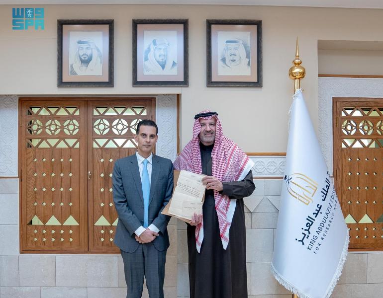 فيصل بن سلمان يستلم وثيقة تاريخية بعثها الملك عبدالعزيز منذ 100 عام