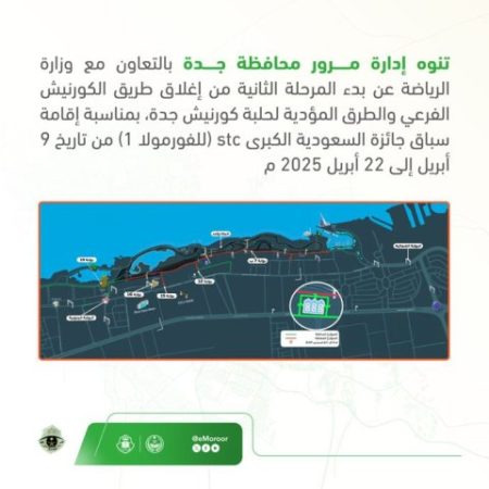 نوهت إدارة المرور بمحافظة جدة وبالتعاون مع وزارة الرياضة عن بدء المرحلة الثانية بإغلاق طريق الكورنيش الفرعي والطرق المؤدية لحلبة كورنيش جدة، بمناسبة إقامة سباق جائزة السعودية الكبرى stc للفورمولا 1.من تاريخ 9 – 22 إبريل 2025م .