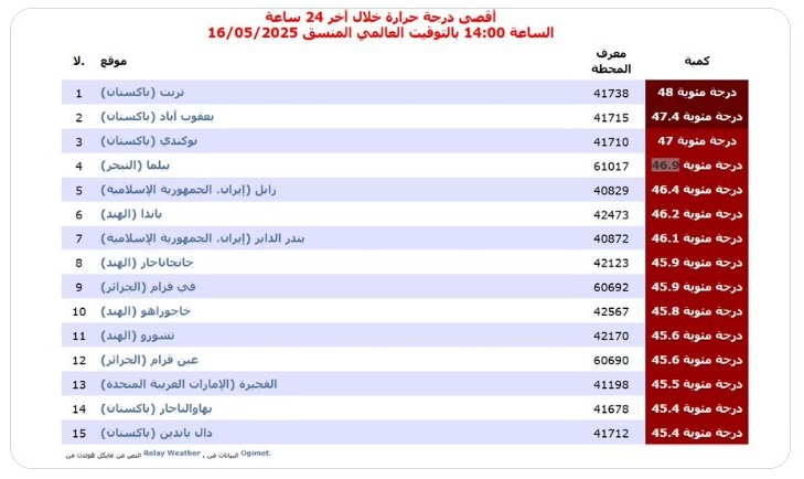 بين المهتم بالطقس والمناخ عبدالعزيز الحصيني أن أعلى حرارة سجلت في العالم خلال”24″ ساعة مساء اليوم الجمعة 1446/11/18هـ هي كالتالي : المركز الأول تربت(باكستان)48°C المركز الثاني يعقوب آباد (باكستان)47.4°C .