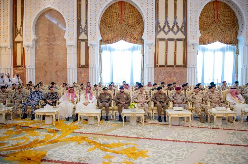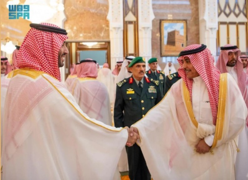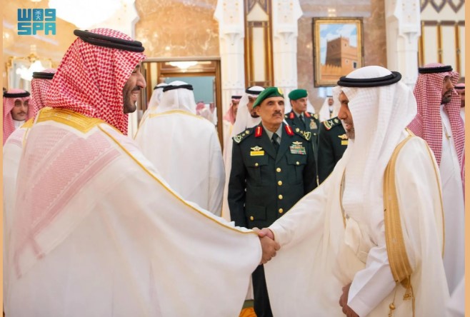 نيابة عن خادم الحرمين الشريفين الملك سلمان بن عبدالعزيز آل سعود القائد الأعلى لكافة القوات العسكرية ـ حفظه الله ـ، استقبل صاحب السمو الملكي الأمير محمد بن سلمان بن عبدالعزيز آل سعود ولي العهد رئيس مجلس الوزراء، في الديوان الملكي بقصر منى، اليوم، المهنئين بعيد الأضحى المبارك، وهم دولة السيد محمد شهباز شريف رئيس الوزراء في جمهورية باكستان الإسلامية، وأصحاب السمو الملكي الأمراء، وسماحة مفتي عام المملكة، وأصحاب الفضيلة العلماء والمشايخ، وكبار المدعوين من دول مجلس التعاون لدول الخليج العربية، وأصحاب المعالي الوزراء، وقادة القطاعات العسكرية المشاركة في حج هذا العام، وقادة الأسرة الكشفية في المملكة المشاركة في الحج.