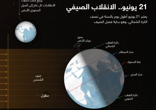 وأضاف الحصيني أن هذا الحدث الفلكي يعلن دخول فصل الصيف فلكياً في النصف الشمالي من الكرة الأرضية، حيث يُسجَّل في هذا اليوم أطول نهار وأقصر ليل خلال العام، لتبدأ بعده تدريجياً عودة النهار إلى التناقص لحساب الليل، وذلك بعد ثلاثة أيام من تعامد الشمس على مدار السرطان.