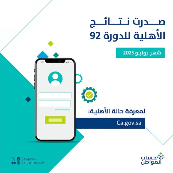 أعلن برنامج حساب المواطن عن صدور نتائج الأهلية للدورة 92، الخاصة بشهر يوليو 2025 – ودعا البرنامج المستفيدين إلى التحقق من أهليتهم عبر تطبيق حساب المواطن أو من خلال البوابة الإلكترونية عبر الرابط التالي: اضغط هنا