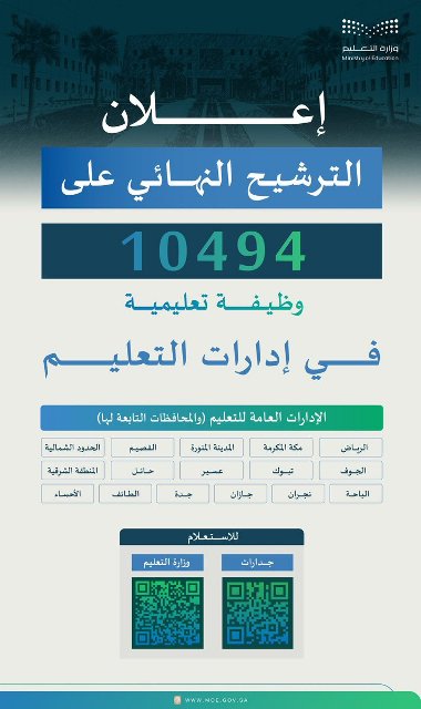 أعلنت وزارة التعليم عن الترشيح النهائي على 10494 وظيفة تعليمية في إدارات التعليم. ويمكن الاستعلام عن الترشيح عبر الرابط التالي : اضغط هنا