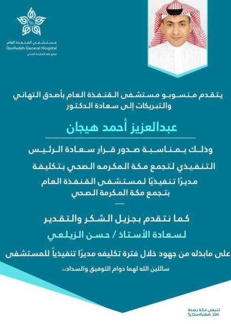 صدر قرار الرئيس التنفيذي لتجمع مكة المكرمة الصحي بتكليف د . عبدالعزيز بن أحمد الهيجان مديراً تنفيذياً لمستشفى القنفذة العام بتجمع مكة المكرمة الصحي .