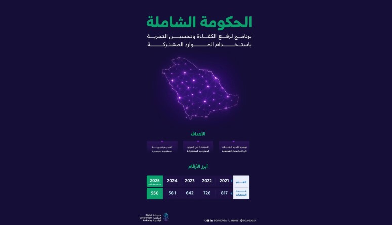 وأطلقت الهيئة برنامج “الحكومة الشاملة” في عام 2022، حيث نجح البرنامج في إغلاق وتقليص عدد المنصات الحكومية من (817) منصة عند إطلاقه إلى (550) منصة مع نهاية النصف الأول من عام 2025؛ ويهدف البرنامج إلى تحسين كفاءة استخدام الموارد الحكومية، وتقديم خدمات رقمية أكثر فعالية، بما يدعم مسيرة التحول الرقمي ويعزز رضا المستفيدين.