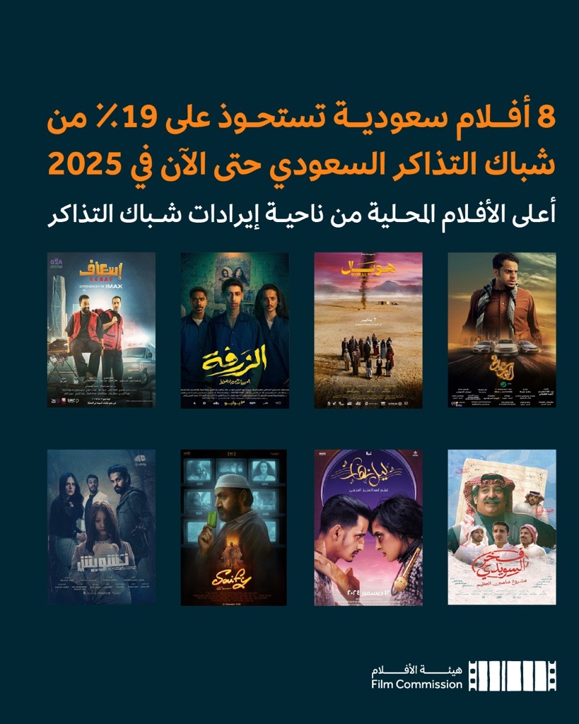 أعلنت هيئة الأفلام السعودية عن تحقيق 100 مليون ريال سعودي قيمة إيرادات الأفلام السعودية من شباك التذاكر منذ بداية 2025 وحتى اليوم.