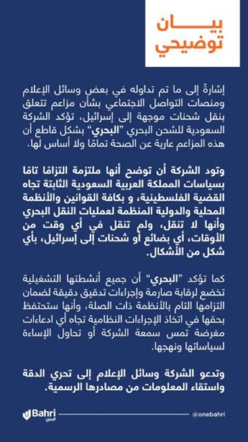 وشددت الشركة على التزامها التام بسياسات المملكة العربية السعودية الثابتة تجاه القضية الفلسطينية، وبكافة القوانين والأنظمة المحلية والدولية المنظمة لعمليات النقل البحري، موضحة أنها لا تنقل، ولم تنقل في أي وقت من الأوقات، أي بضائع أو شحنات إلى إسرائيل، بأي شكل من الأشكال.