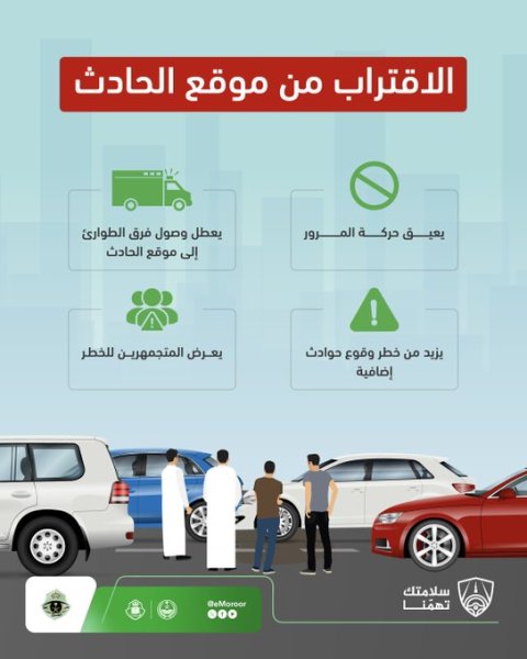 وأوضح المرور السعودي أن التجمهر حول مواقع الحوادث يؤدي إلى إعاقة حركة السير، ويعطل وصول فرق الطوارئ إلى المكان، كما يعرض المتجمهرين أنفسهم للخطر ويزيد من احتمالية وقوع حوادث إضافية.