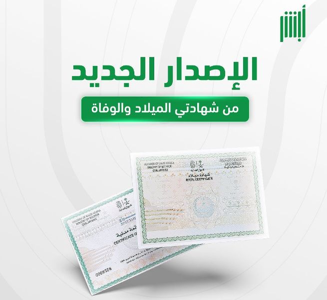 وتتميز وثائق شهادة الميلاد والوفاة الجديدة بإضافة البيانات باللغة الإنجليزية ورمز الاستجابة السريع (QR)، الذي يمكن من خلاله التأكد من معلومات الوثيقة وطباعتها عبر منصة (أبشر).