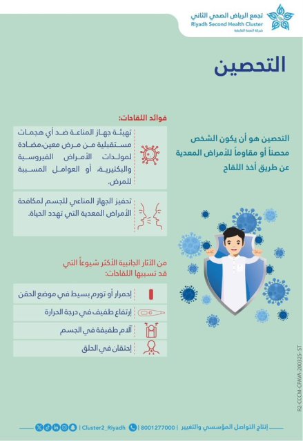 أكد تجمع الرياض الصحي الثاني أهمية التحصينات في تعزيز مناعة الجسم والوقاية من الأمراض المعدية، وذلك ضمن مشاركته في فعاليات «الشهر الوطني للمناعة».