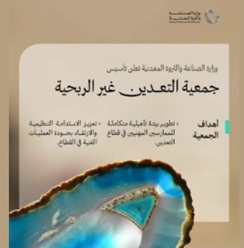 أعلنت وزارة الصناعة والثروة المعدنية، عن تأسيس جمعية التعدين غير الربحية؛ التي تركز على توفير بيئة تأهيلية متكاملة لتطوير مهارات الممارسين المهنيين في قطاع التعدين، والمساهمة في الارتقاء بجودة العمليات الفنية، وتعزيز الاستدامة التنظيمية في القطاع، بما يضمن تبني أفضل معايير الحوكمة والشفافية، وذلك في إطار جهود الوزارة لتمكين المنظمات غير الربحية في قطاعي الصناعة والتعدين، إيمانًا بدورها في دعم التنمية الاقتصادية والاجتماعية بالمملكة.