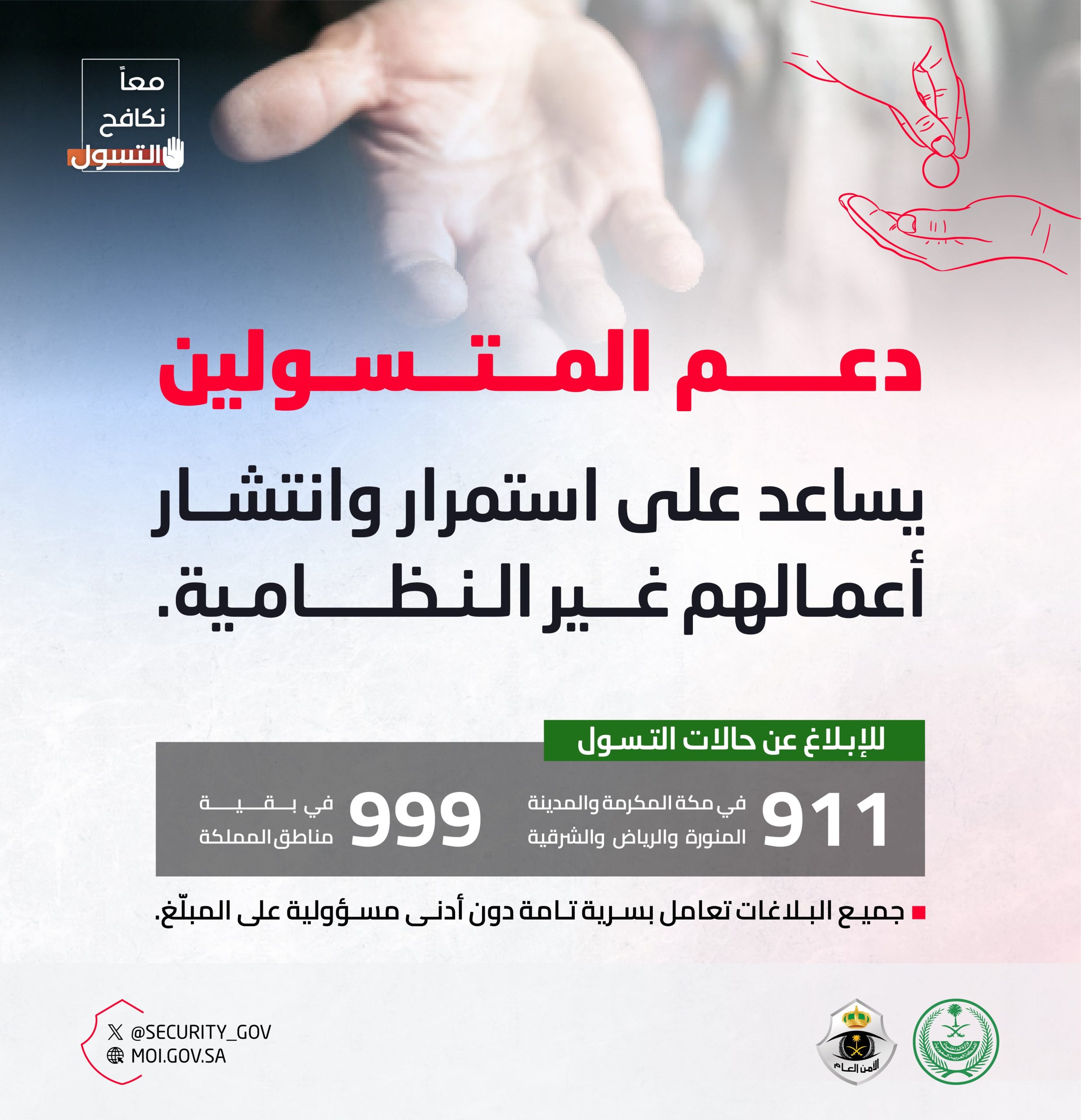 ودعت الجهات الأمنية المواطنين والمقيمين إلى التعاون والإبلاغ عن حالات التسول من خلال الرقم (911) في مناطق مكة المكرمة، والمدينة المنورة، والرياض، والمنطقة الشرقية أو عبر الرقم (999) في بقية مناطق المملكة.