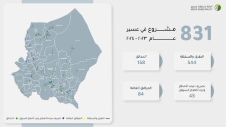 نشر أمين منطقة عسير المهندس عبدالله الجالي عبر حسابه في منصة أكس إحصائية لعدد المشاريع البلدية التي نفذت في محافظات منطقة عسير بمجموع 831 في عسير ما بين عامي 2023 – 2024 م .