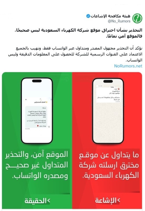 وقالت الهيئة في توضيح لها : التحذير بشأن اختراق موقع شركة الكهرباء السعودية ليس صحيحًا، فالموقع آمن تمامًا ونؤكد أن التحذير مجهول المصدر ومتداول عبر الواتساب فقط، ونهيب بالجميع الاعتماد على القنوات الرسمية للشركة للحصول على المعلومات الدقيقة وليس الواتساب.