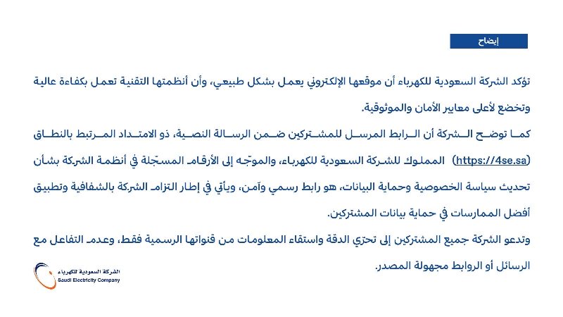 وأضافت الشركة، في بيان لها: “أن الرابط المرسل للمشتركين ضمن الرسالة النصية، ذو الامتداد المرتبط بالنطاق https://se.sa المملوك للشركة السعودية للكهرباء والموجّه إلى الأرقام المسجلة في أنظمة الشركة بشأن تحديث سياسة الخصوصية وحماية البيانات هو رابط رسمي وآمن ويأتي في إطار التزام الشركة بالشفافية وتطبيق أفضل الممارسات في حماية بيانات المشتركين”.