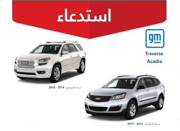 أعلنت وزارة التجارة عن استدعاء 4657 مركبة من طرازات “شيفروليه ترافرس” و”جي إم سي أكاديا” من إنتاج الأعوام 2014 حتى 2017، وذلك بسبب خلل في نافخ الوسادة الهوائية لجهة السائق قد يؤدي إلى تمزق الوسادة وخروج شظايا معدنية حادة عند وقوع حادث، مما قد يتسبب في خطر الإصابة أو الوفاة.