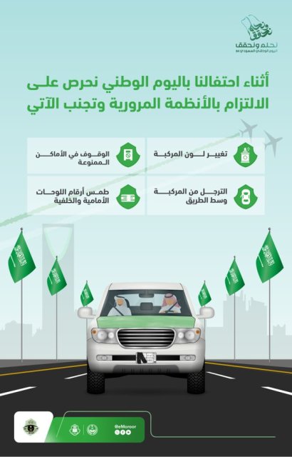 دعا المرور السعودي عبر حسابه في منصة أكس إلى الحرص على الالتزام بالأنظمة المرورية أثناء احتفالنا باليوم الوطني.