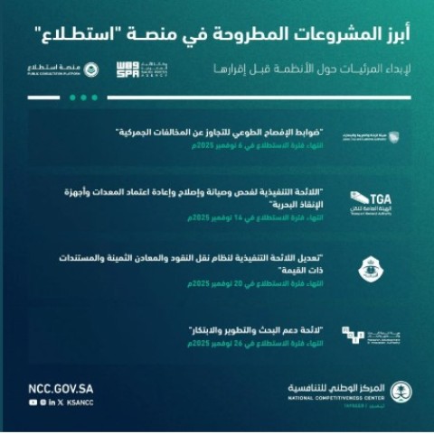 طرحت المنصة الإلكترونية الموحدة لاستطلاع آراء العموم والجهات الحكومية (استطلاع) التابعة للمركز الوطني للتنافسية، 28 مشروعًا ذا صلة بالشأن الاقتصادي والتنموي، بالتعاون مع 12 جهة حكومية؛ لتمكين أصحاب المصلحة، من إبداء المرئيات والمقترحات حولها قبل إقرارها.