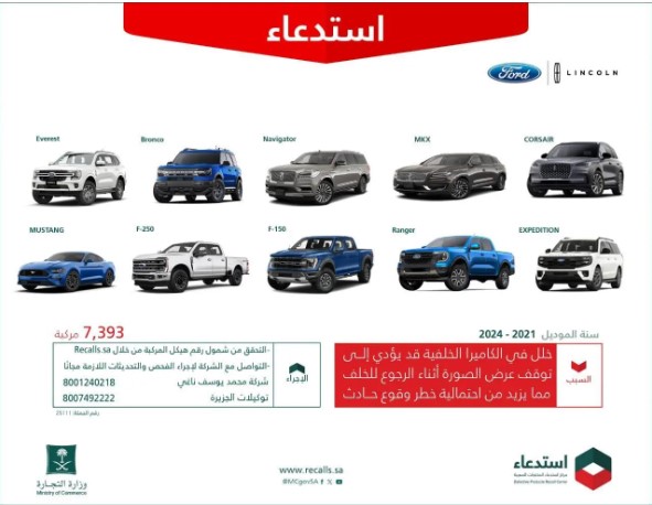 استدعت وزارة التجارة اليوم (7,393) مركبة (لينكون – فورد) من عدة طرازات لسنة الصنع (2021 إلى 2024) لخلل في الكاميرا الخلفية قد يؤدي إلى توقف عرض الصورة أثناء الرجوع للخلف مما يزيد من احتمالية خطر وقوع حادث.
