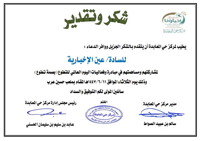 تلقت ” عين ” الإخبارية شهادة شكر وتقدير من مركز ” حي المعابدة ” نظير مشاركتها ومساهمتها في مبادرة وفعاليات اليوم العالمي للتطوع ” بصمة تطوع ” والذي يؤكد دعم الصحيفة لكل الفعاليات والمناشط المجتمعية .