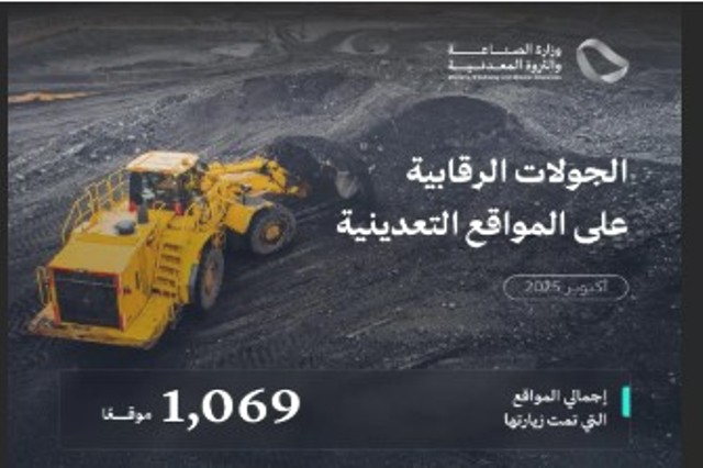 نفذت وزارة الصناعة والثروة المعدنية -ممثلة في وكالة الإشراف على العمليات التعدينية- 1,069 جولة رقابية على عددٍ من المواقع التعدينية في مختلف مناطق المملكة خلال شهر أكتوبر الماضي، ضمن جهودها في التحقق من التزام المواقع التعدينية بنظام الاستثمار التعديني، وتوجيه الإنذارات عند رصد أي مخالفات، تطبيقًا لمبدأ الإنذار قبل إقرار العقوبة.