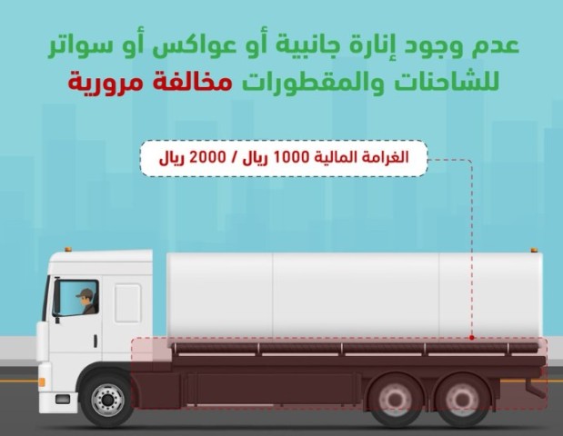 حذّرت الإدارة العامة للمرور من عدم وجود إنارة جانبية أو عواكس أو سواتر للشاحنات والمقطورات، مؤكدةً أن ذلك يُعد مخالفة مرورية تُعرّض مرتكبيها للعقوبة النظامية.