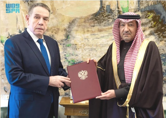 تسلم الرسالة، معالي نائب وزير الخارجية المهندس وليد بن عبدالكريم الخريجي، خلال استقباله في مقر الوزارة بالرياض، سفير روسيا الاتحادية لدى المملكة سيرجي كوزلوف.