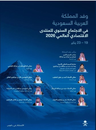 برئاسة صاحب السمو الأمير فيصل بن فرحان بن عبدالله وزير الخارجية، تشارك المملكة بوفد رفيع المستوى في الاجتماع السنوي للمنتدى الاقتصادي العالمي 2026 بمدينة دافوس السويسرية خلال الفترة من 19 إلى 23 يناير الجاري.