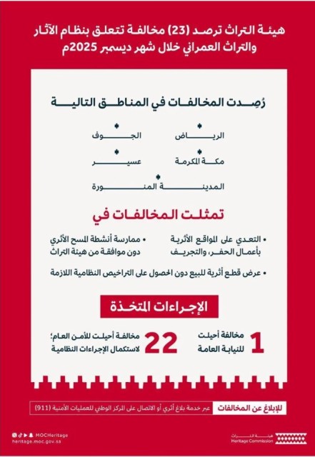أعلنت هيئة التراث، رصدها (52) مخالفة خلال شهر ديسمبر عام 2025م، تتعلق بنظام الآثار والتراث العمراني، وذلك ضمن أعمالها في الرقابة والمتابعة التي تنفذها لحماية مواقع التراث الثقافي والقطع الأثرية من أي تجاوزات، تطبيقًا للأنظمة والتعليمات ذات الصلة، وتعزيز الحضور الرقابي في مختلف مناطق المملكة.