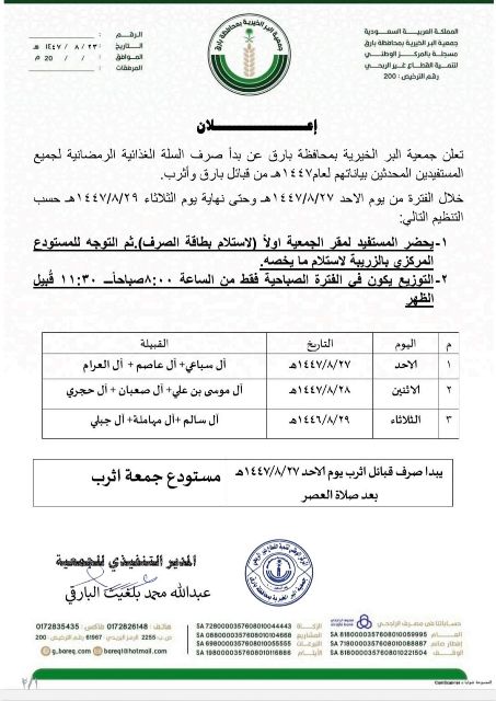 أعلنت الجمعية الخيرية بمحافظة بارق عن بدأ صرف السلة الغذائية الرمضانية لجميع المستفيدين المحدثين بياناتهم لعام 1447هـ من قبائل بارق وأثرب خلال الفترة من يوم الاحد 27 شعبان 1447هـ حسب التنظيم المرفق :