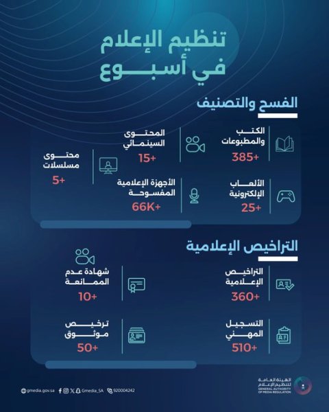 وأشارت إلى إصدار 360 ترخيصًا إعلاميًّا، و10 شهادات عدم ممانعة، و510 تسجيلات مهنية، و50 ترخيصاً موثوقاً.