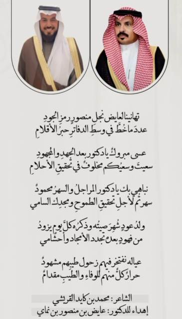جادت قريحة شاعر النظم محمد عايض بن كايد بقصيدة جديدة بعد حصول رئيس نادي القوس بمحافظة الخرمة سابقاً التربوي عايض منصور بن نماي على درجة الدكتوراه من جامعة الأمام محمد بن سعود الإسلامية في تخصص التربية بتقدير ممتاز مع مرتبة الشرف