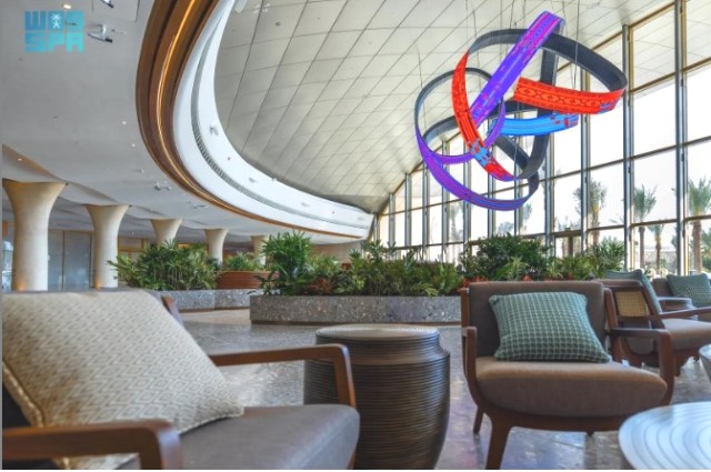 وفي افتتاحه المرحلي، يستقبل المطار ضيوفه بتحف فنية صُممت خصيصًا لتعكس روح المكان، منها العمل الفني “شاتل”، الذي ينبض بروح “السدو” في قلب مركز الاستقبال بالمطار، بارتفاع ستة أمتار وعرض تسعة أمتار، وبوزن يقارب طنًا واحدًا، حيث تتماوج شاشات العمل بعرض أنماط حيّة تحاكي حركة الرياح وتدفق مياه البحر الأحمر، في تفاعل ديناميكي يجمع بين الطبيعة والتقنية الحديثة, واستلهم الفنان إبداعه من فن “السدو” التقليدي الذي أُدرج ضمن قائمة التراث الثقافي غير المادي لليونسكو عام 2020، ليحمل العمل نبض التراث المحلي بين خيوطه الرقمية.