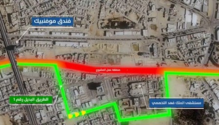 وتابعت بقولها وذلك لرفع هيكل جسر المشاة مقابل مستشفى الملك فهد التخصصي ، لذا تهيب اللجنة بمستخدمي الطريق السير عبر البدائل المشار اليها بالصورة اعلاه خلال فترة الإغلاق.
