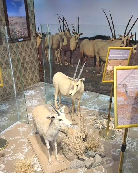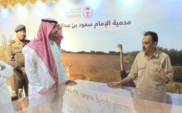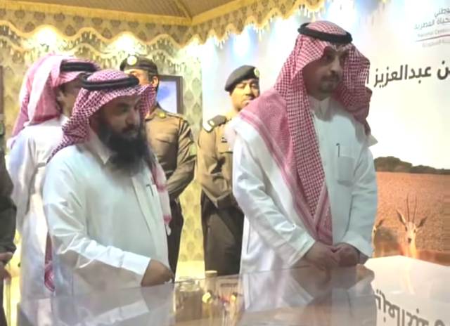 ثم استمع بعد الجولة إلى شرح من مدير المحمية عن ما تحوية من حيوانات ونباتات رعوية وما اجري من أبحاث ودراسات على طبيعة الحيوانات والنباتات داخل المحمية واطلع بعد ذلك على المعرض الدائم.