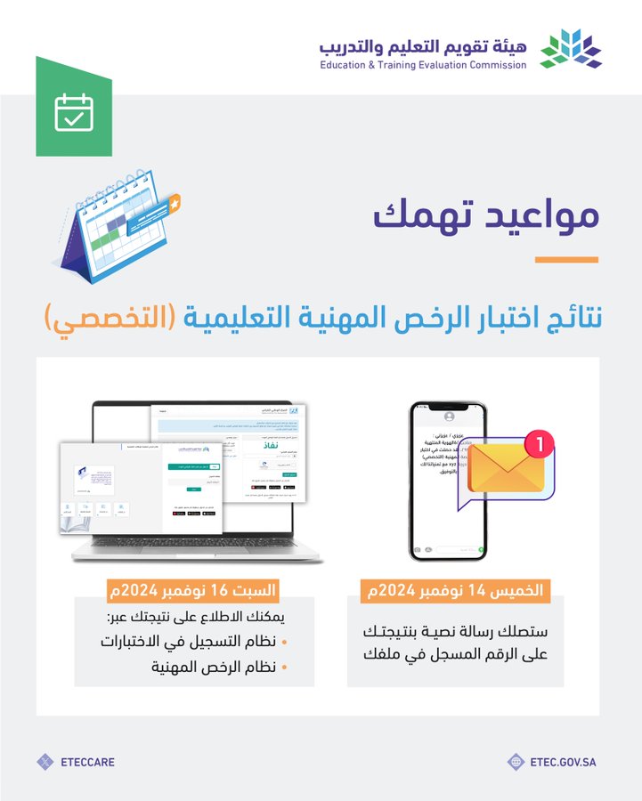 أعلنت هيئة تقويم التعليم والتدريب، أن نتيجة اختبار الرخصة المهنية التعليمية (التخصصي)، ستصل اليوم الخميس 14 نوفمبر 2024، للمتقدمين عبر رسالة نصية (SMS) على الأرقام المسجلة في النظام، وستتاح النتائج على نظام التسجيل ونظام الرخص المهنية مساء يوم السبت 16 نوفمبر 2024.