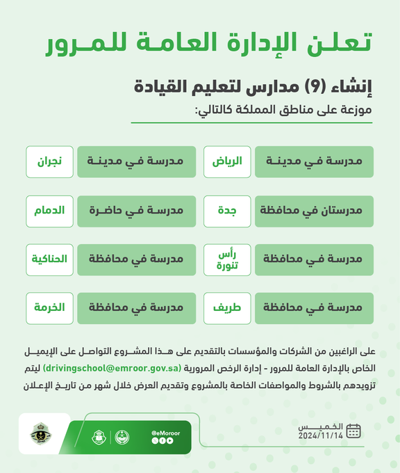أعلنت الإدارة العامة للمرور، اليوم، عن مشروع لإنشاء (9) مدارس لتعليم القيادة موزعة على بعض مناطق المملكة، داعيةً الراغبين من الشركات للتقديم.