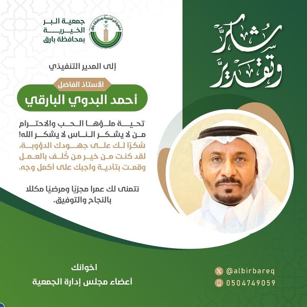 ودعت جمعية البر الخيرية بمحافظة بارق مديرها التنفيذي السابق الأستاذ أحمد البدوي علي البارقي بعد سنين من العطاء والجهود التي قدمها للجمعية متمنية له المزيد من النجاح في موقع أخر الجدير بالذكر أن البدوي كان يشغل مدير فريق بوارق الخير التطوعي وأيضا هو رائد كشفي وعضوا في جمعية السلام للإغاثة والطوارئ .