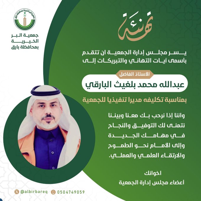وفي ذات السياق قرر مجلس إدارة الجمعية تكليف عبدالله محمد بلغيث البارقي مديراً تنفيذياً للجمعية متمنين له التوفيق في مهامه الجديدة الموكلة له .