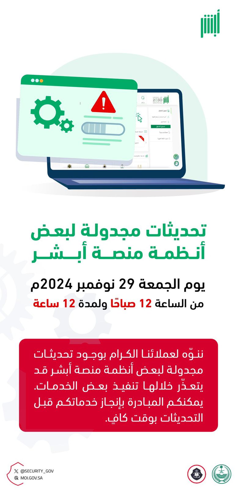 منصة #أبشر تعلن عن تحديثات مجدولة يوم الجمعة المقبل 29 نوفمبر