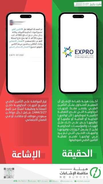 أكدت هيئة كفاءة الإنفاق والمشروعات الحكومية أن التعميم المتداول بشأن التأمين الطبي يقتصر فقط للجهات الحكومية التي تقدم التغطية التأمينية لمنسوبيها، بحسب لوائح تنظيم العمل فيها وتنظيمها الذي ينص على ذلك مثل: الهيئات والمؤسسات الحكومية، ولا يشمل الوزارات وفروعها والجهات الأخرى التي لم يرد في لوائحها تقديم تغطية التأمين الطبي لمنسوبيها.