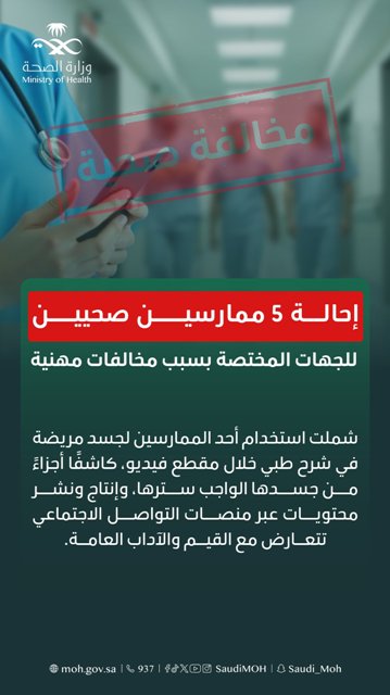 أعلنت وزارة الصحة، إحالة خمسة ممارسين صحيين إلى الجهات المختصّة للتحقيق، على خلفية ارتكابهم مخالفات مهنية، عبر منصّات التواصل الاجتماعي في منطقتَي الرياض والشرقية.